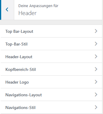 Header Layout: Definiert wo das Menü angezeit wird. Probieren Sie verschiedene Einstellungen aus.